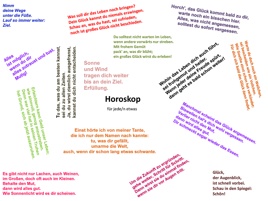 Bei den üblichen Horoskopen wiederholen sich Voraussagen und Weisungen regelmäßig. Um die Suche zu vereinfachen, wird vorgeschlagen, sich hier die passenden „Vorhersagen“ nach Bedarf auszusuchen.
