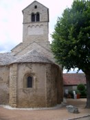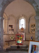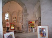Weiter ging es nach Igé. In Igé steht eine Kapelle aus dem 11. Jh. Zu unserer Überraschung fand gerade im frisch renovierten Innenraum eine Ausstellung des Malers und Installationskünstlers Georges Kulik statt; er gestattete uns das Fotografieren und die Veröffentlichung der Aufnahmen auf meiner Website . Die Bilder waren ein Farbtupfer im schlichten weißen Innenraum; dieser wurde durch die farbigen Präsentationen wesentlich aufgewertet.